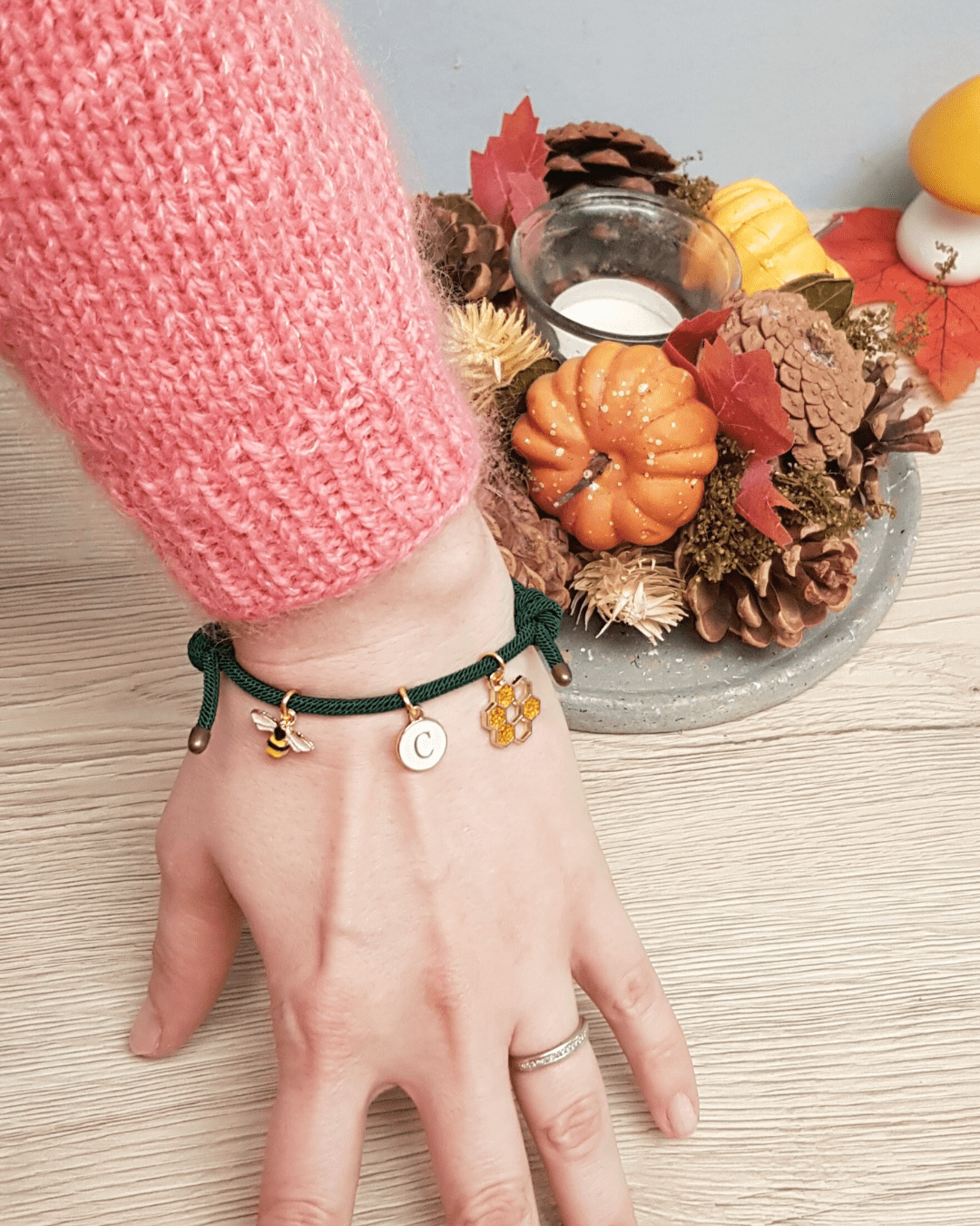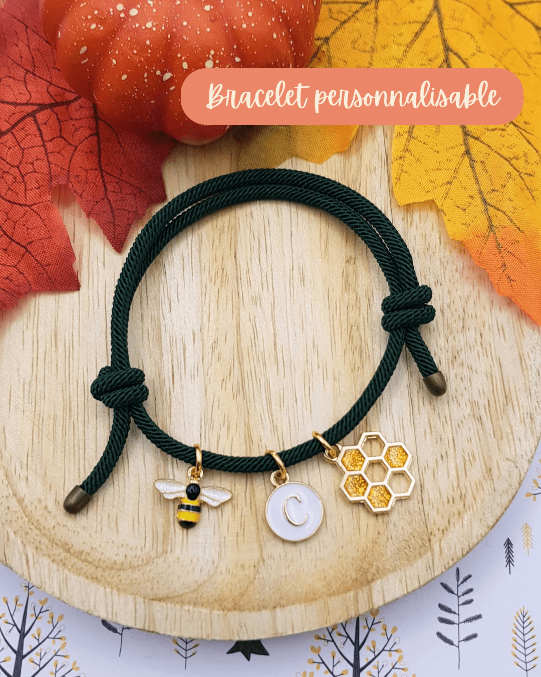 Si vous optez par exemple pour un bracelet de couleur vert composé de 3 charms comme sur la photo, voici comment transmettre votre choix : abeille, lettre « c », alvéole d'abeille.