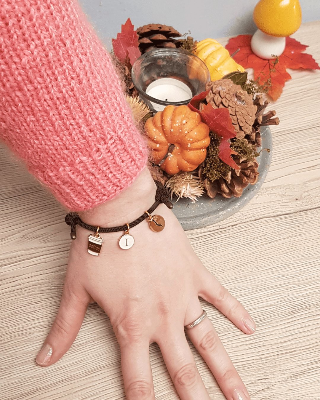 Si vous optez par exemple pour un bracelet de couleur marron composé de 3 charms comme sur la photo, voici comment transmettre votre choix : coffee, lettre « i », grain de café.