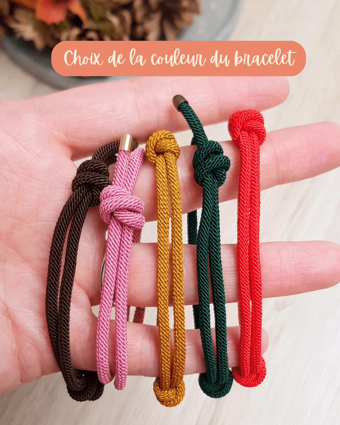 Pour créer un bracelet qui vous ressemble, commencez par choisir la couleur du cordon parmi les différentes options disponibles. Ensuite, sélectionnez entre 3, 4 ou 5 charms parmi les modèles proposés dans les marqueurs de maille à l’unité. Veuillez noter que chaque lettre choisie compte comme un charm à part entière.