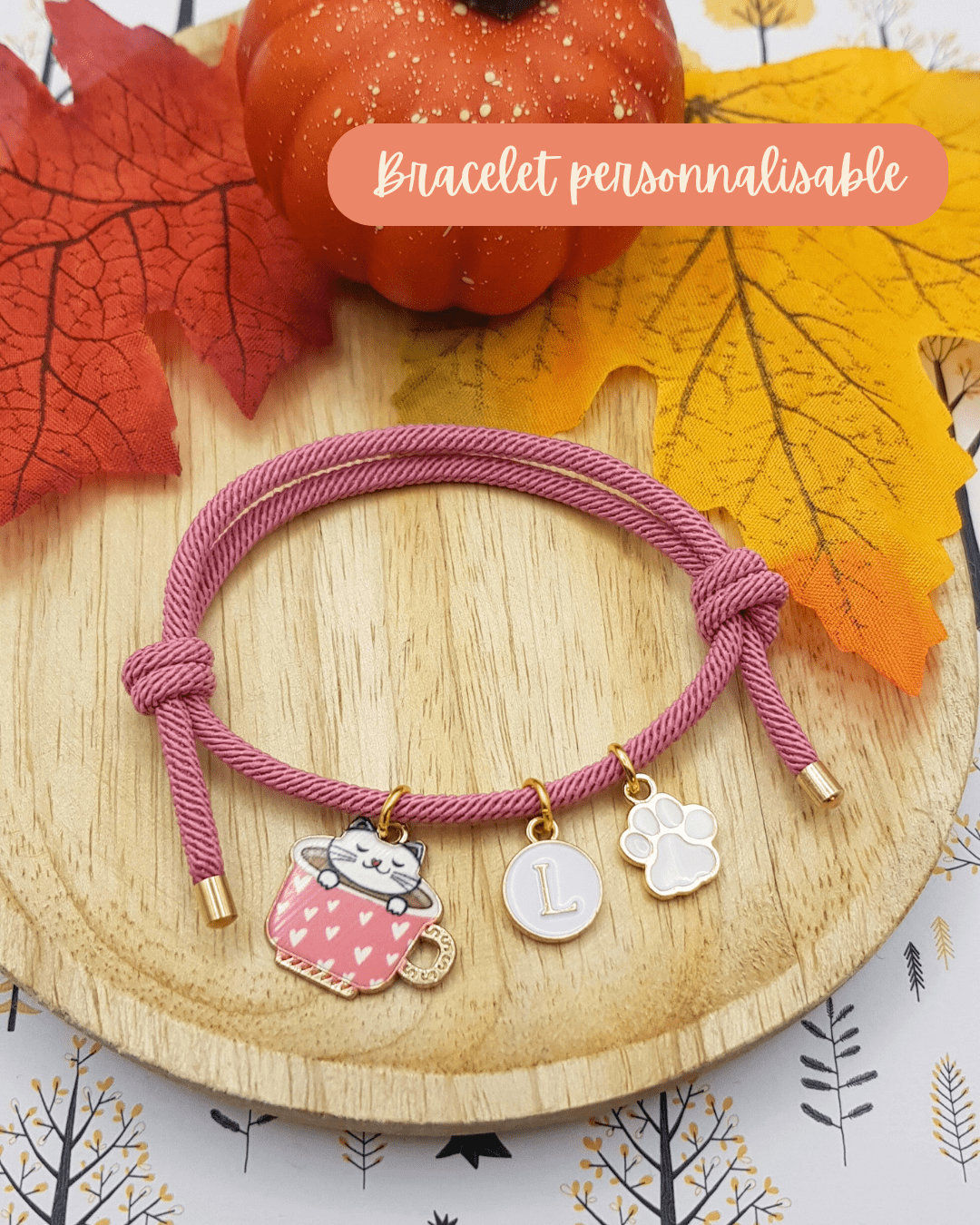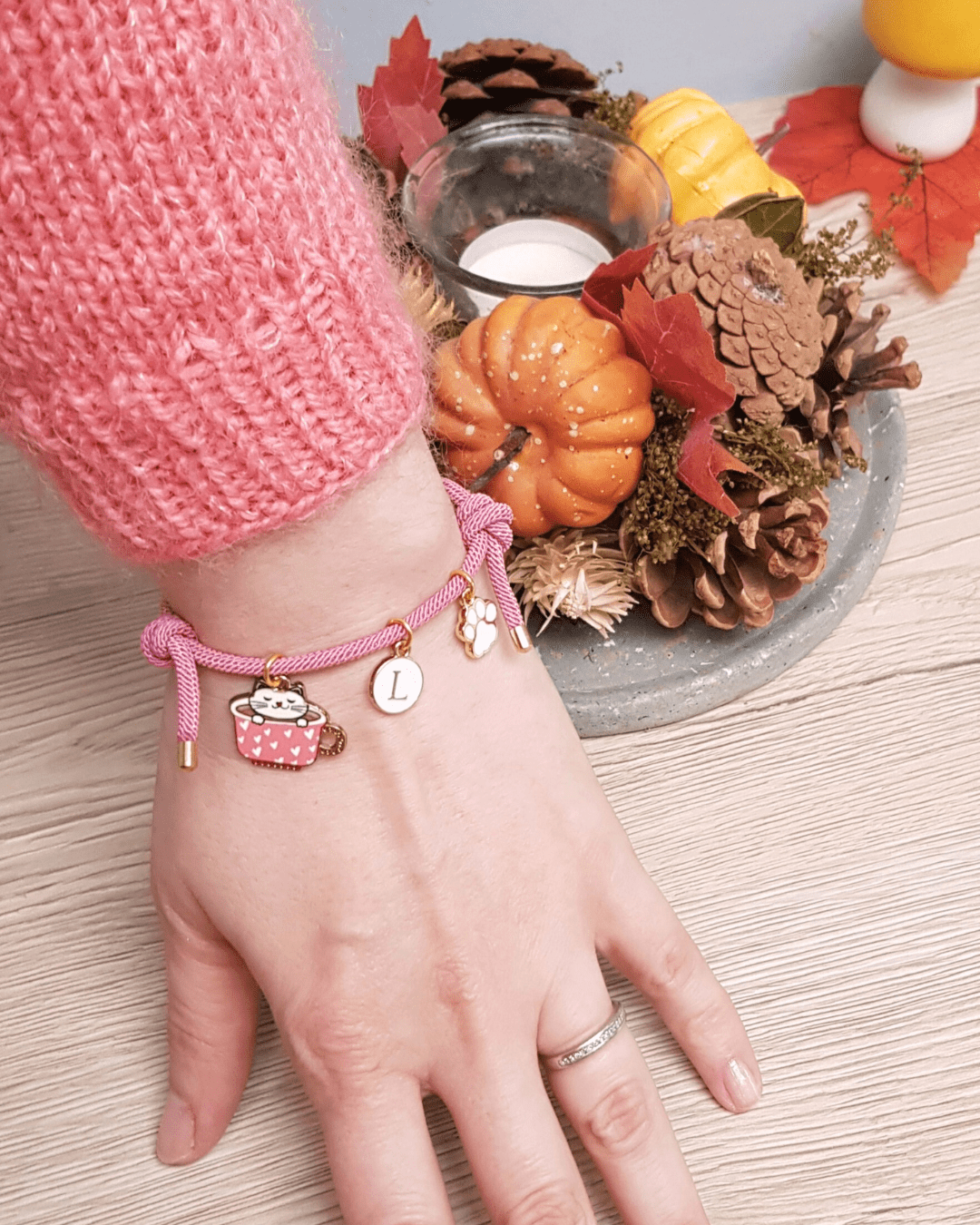 Si vous optez par exemple pour un bracelet de couleur rose composé de 3 charms comme sur la photo, voici comment transmettre votre choix : chat tasse d'amour 3, lettre « L », patte de chat blanc.
