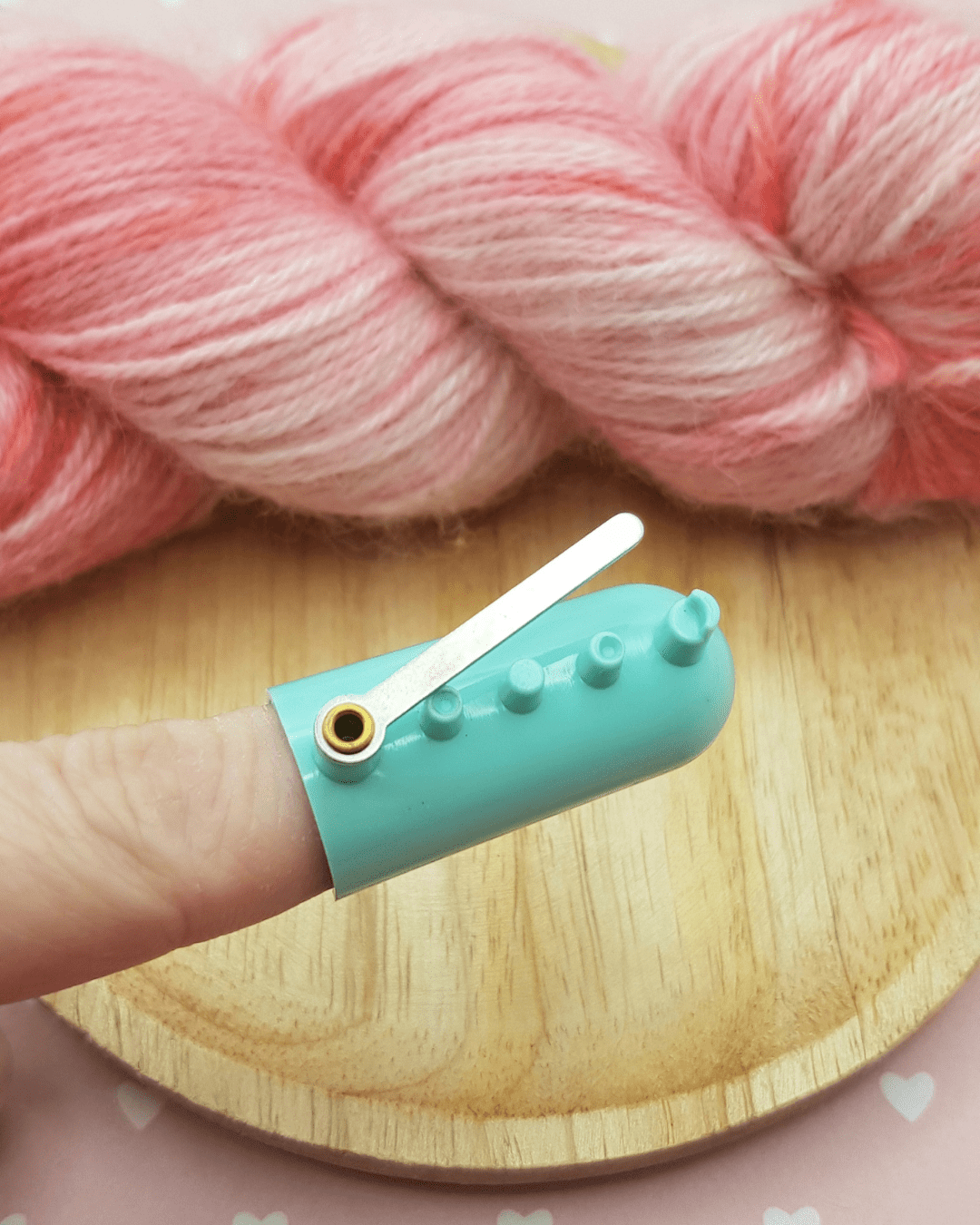 Grâce aux œillets situés sur la face supérieure du dé à coudre, il est possible de glisser doucement jusqu'à quatre fils de laine, sans qu'ils ne s'emmêlent, sur l'aiguille à tricoter.